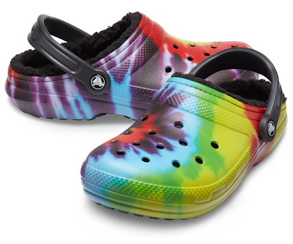 Classic Lined Tie-Dye Clog Item 206341 The Snuggle Is Real Timeless fun and full of peaceful good vibes the bright pops of tie-dye graphics on these clogs are the perfect way to make a groovy style statement on the go or while youre just hangin out. Lined roomy fit tie dye Crocs. Timeless fun and full of peaceful good vibes the bright tie-dye Crocs for kids add the perfect groovy statement to any style.